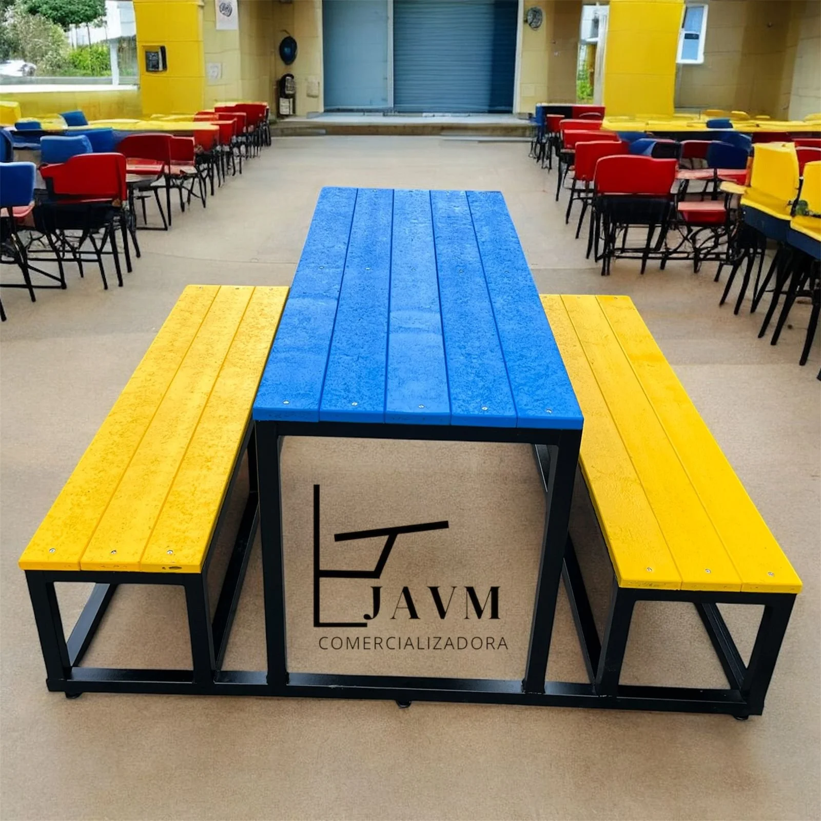 Fabricada en tubería cuadrada de 1 y 1/2” en calibre 18, pintura electroestática, madera plástica reciclada amigable con el medio ambiente.